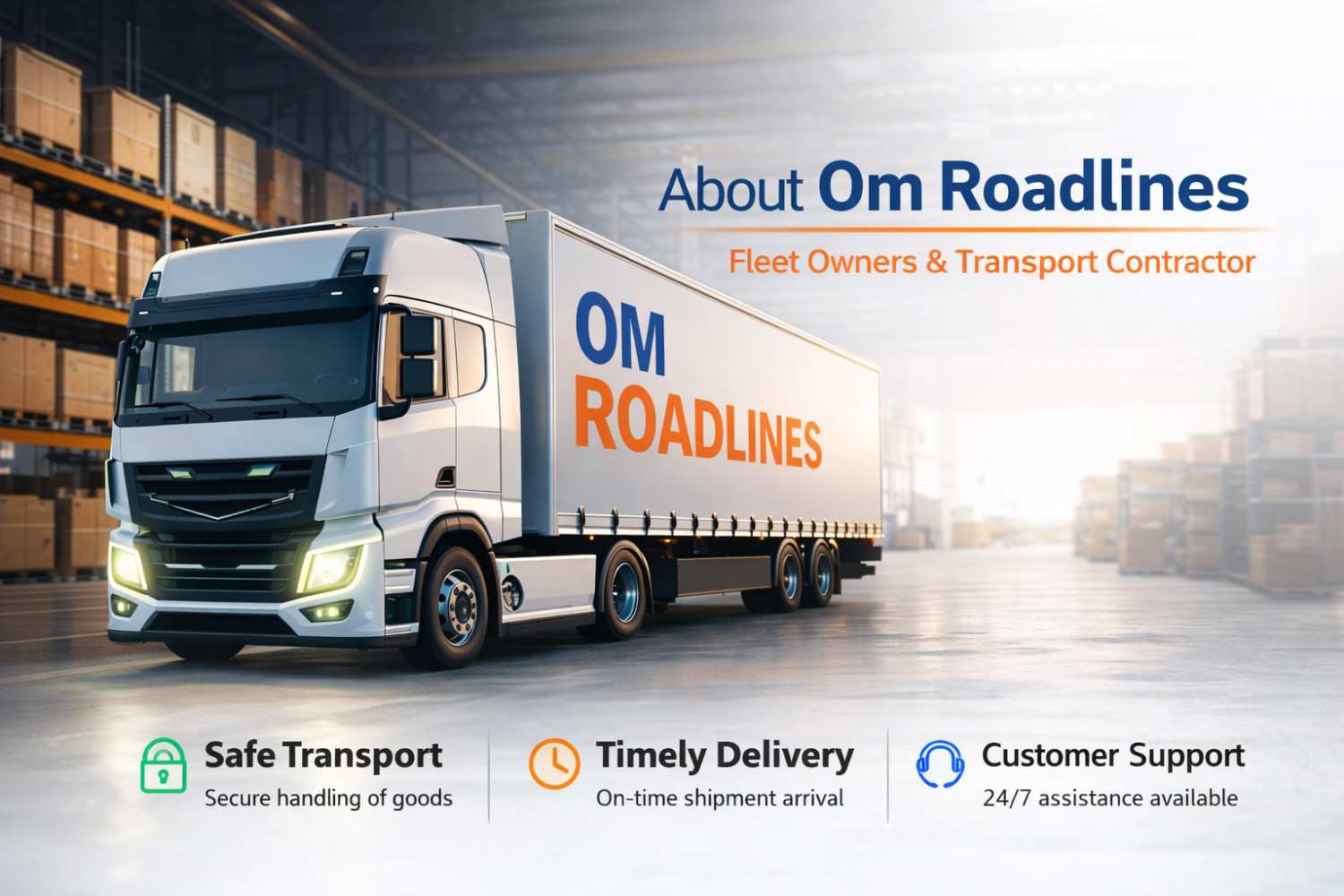 Om Roadlines is a trusted transportation and logistics service provider committed to delivering goods safely and on time across India. With years of experience in the transport industry, we provide reliable and efficient logistics solutions for businesses and individuals. Our company focuses on customer satisfaction, safety, and timely delivery. We use modern tracking systems and professional drivers to ensure secure and smooth transportation of your goods.